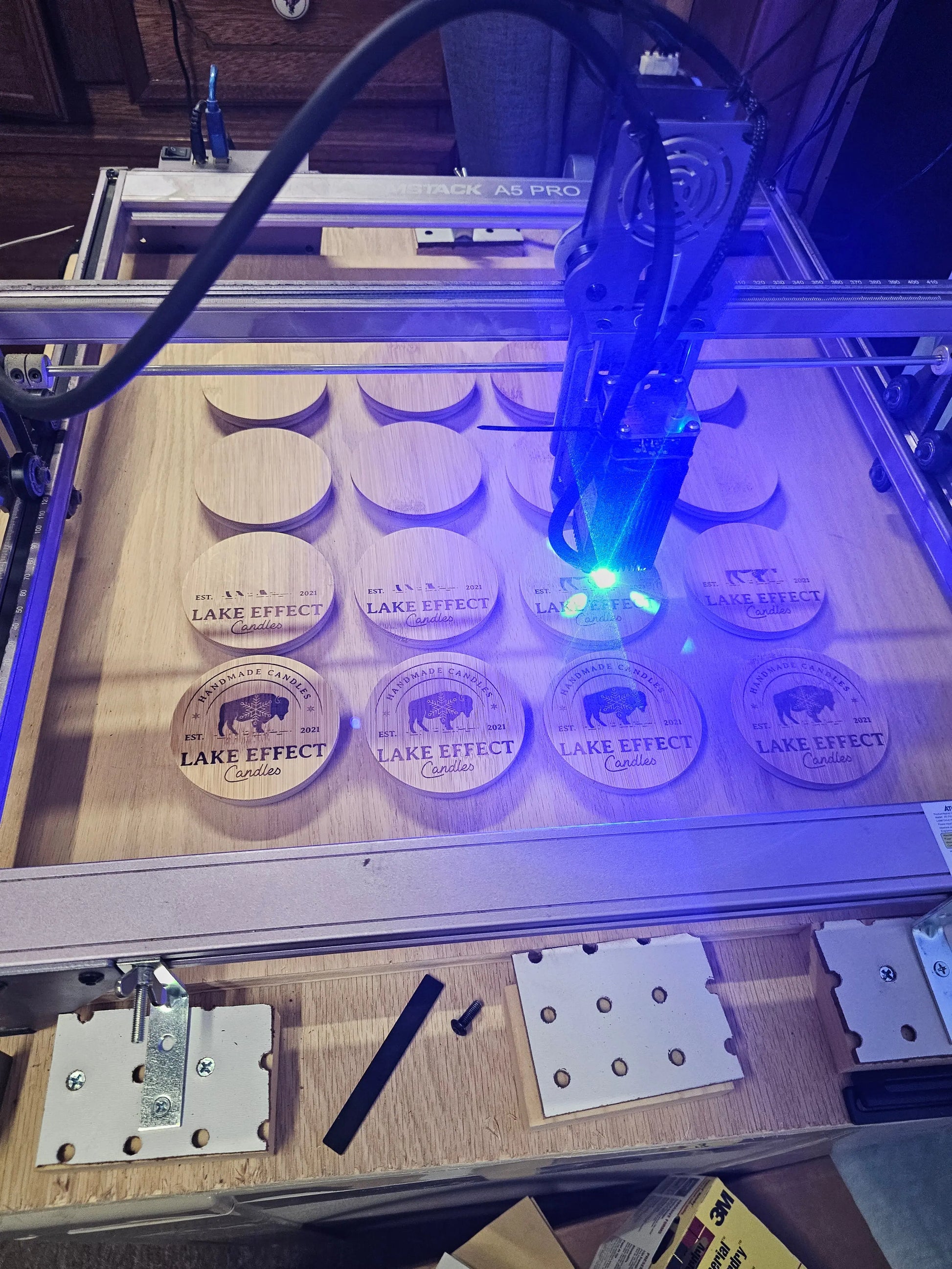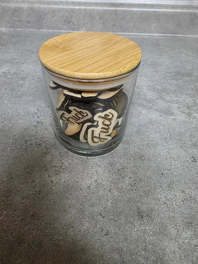 This tumbler is filled with 50 laser engraved wooden fucks, each cut and engraved right here in our shop from high quality void-free Baltic birch.
